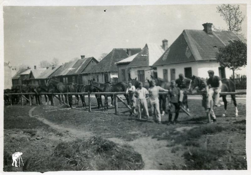 Fotografia żołnierzy niemieckich pozujących z końmi na tle budynków.Zdjęcie wykonano w Radomyślu Wielkim w okresie okupacji.