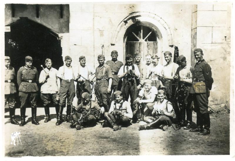 Fotografia przedstawia grupę żołnierzy niemieckich, pozujących do zdjęcia przed budynkiem.