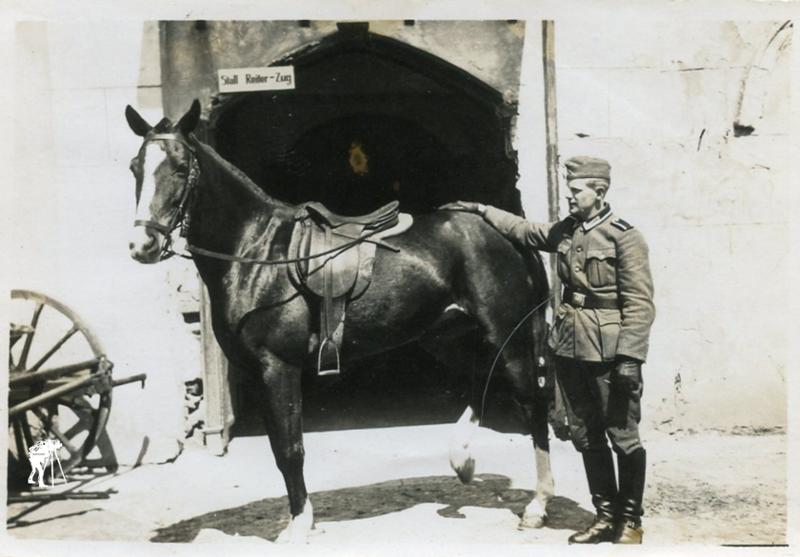 Fotografia przedstawia żołnierza niemieckiego pozującego z koniem przed budynkiem stajni w Radomyślu Wielkim.