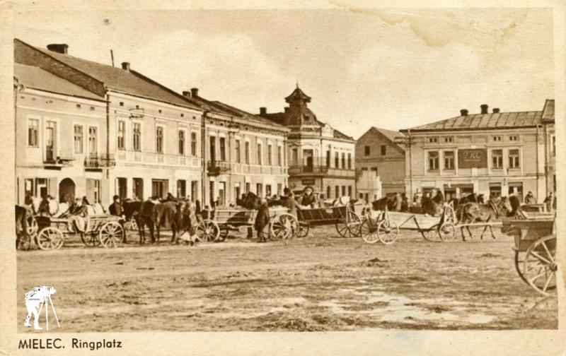 Pocztówka przedstawia widok na mielecki plac targowy w rynku w okresie okupacji niemieckiej.